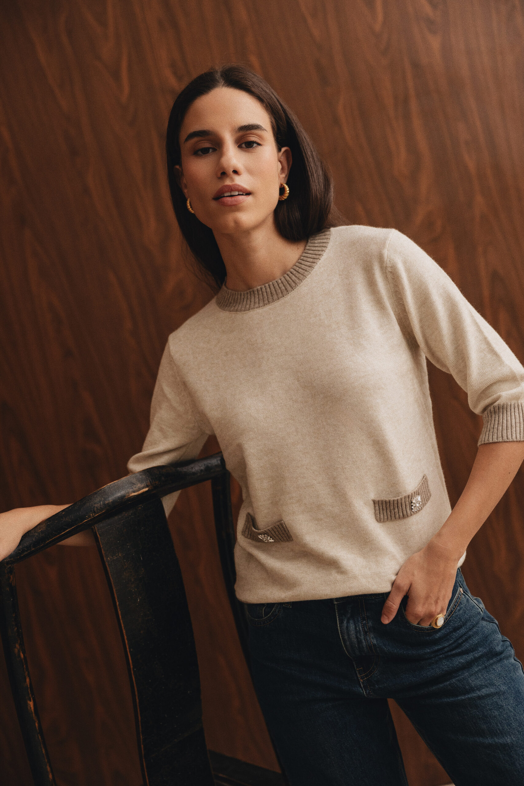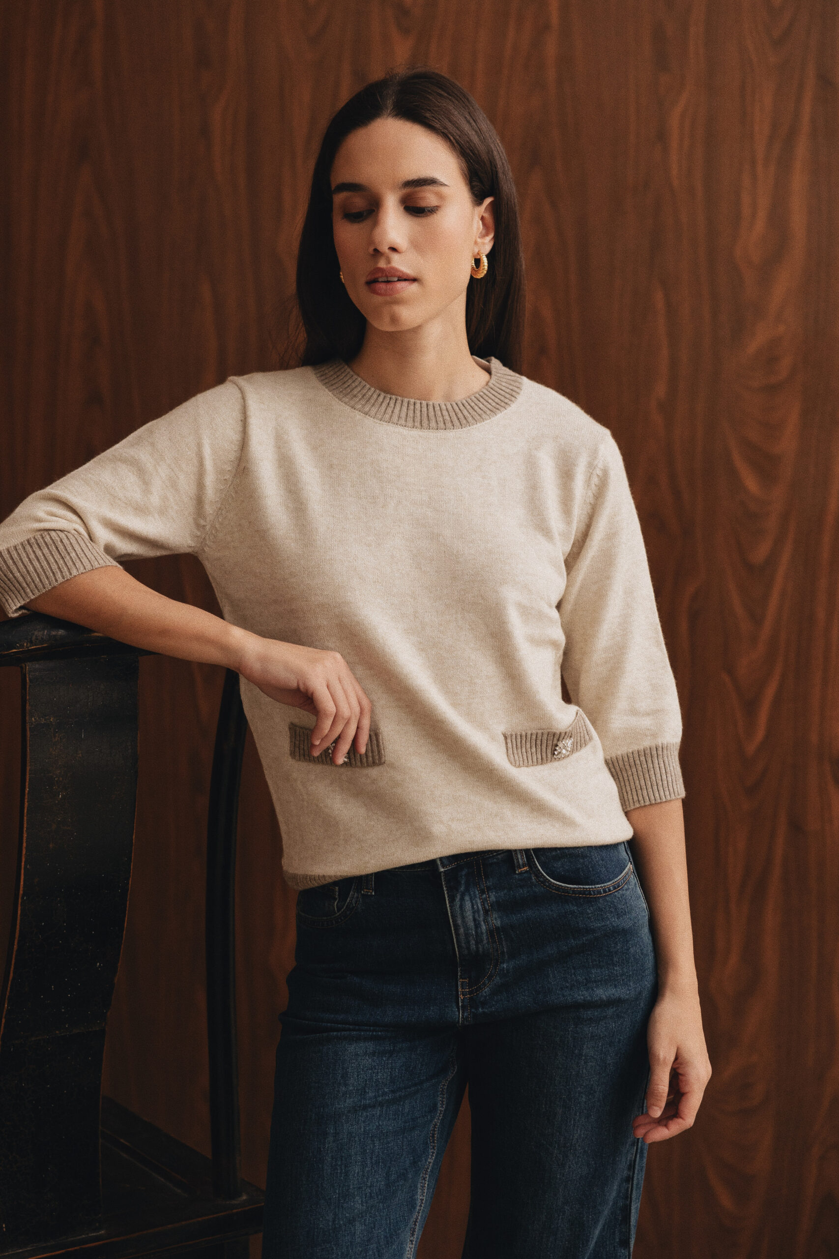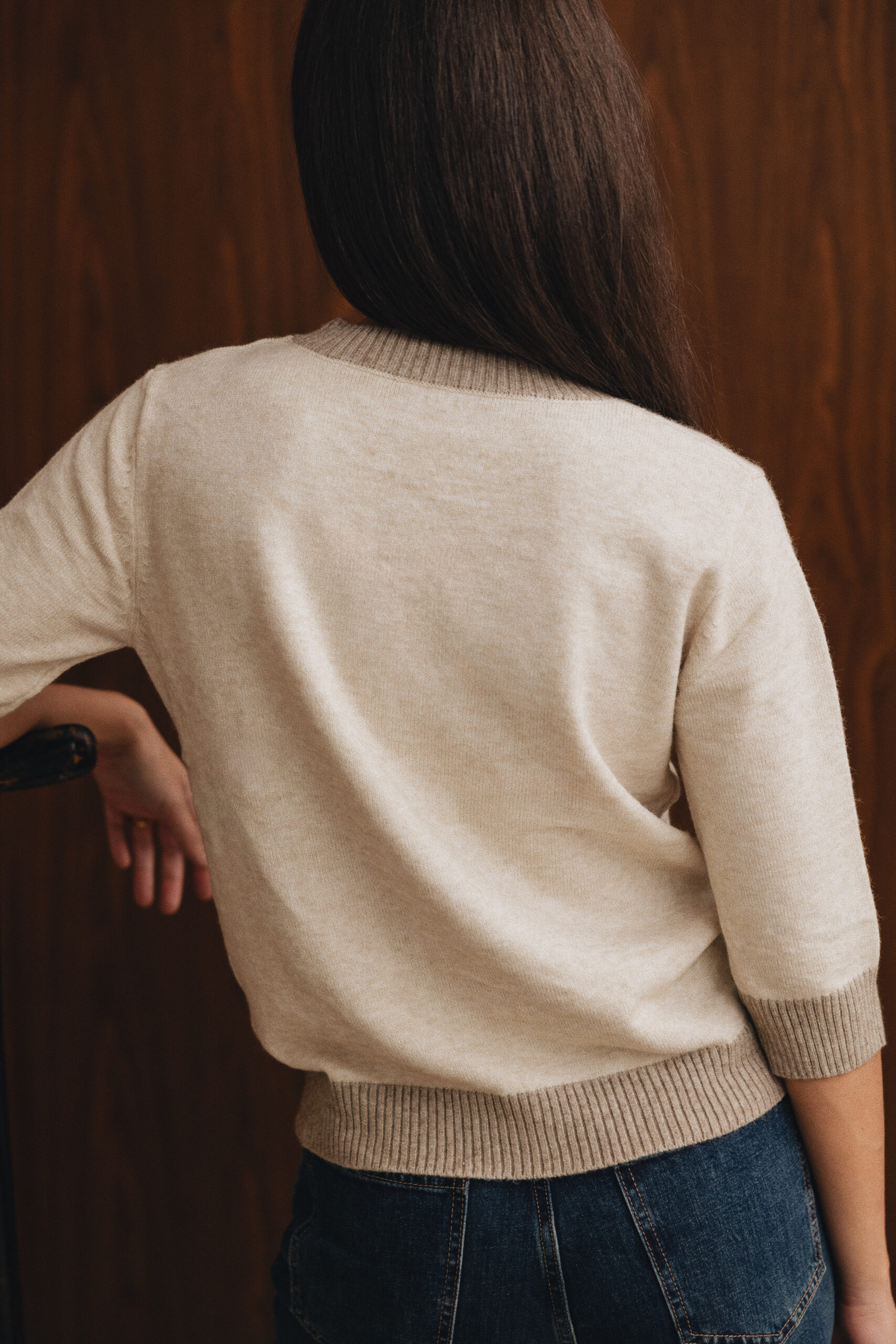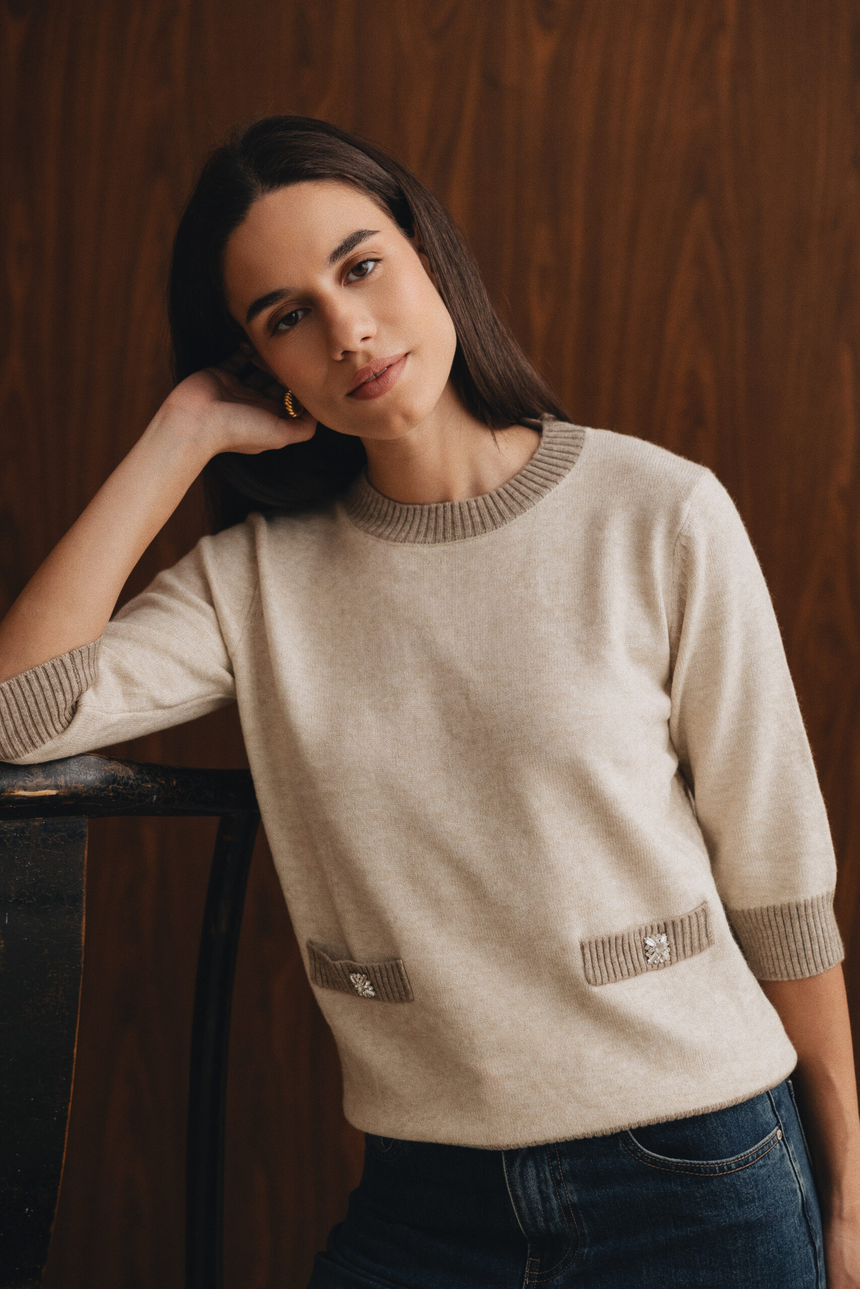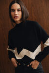 - Πλεκτό με διχρωμία στο λαιμό, στα μανίκια και στο τελείωμα